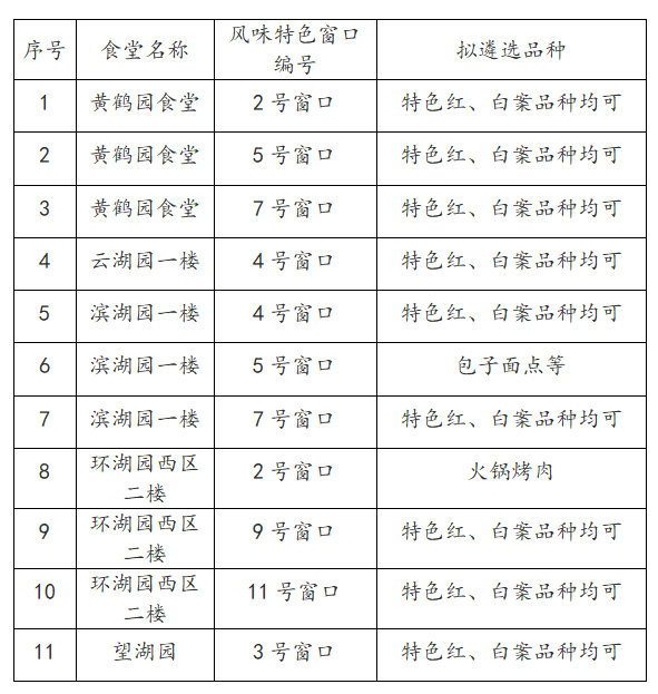 为提升特色餐饮服务质量,满足师生餐饮多样化个性化需求,拟对学校两校区5个食堂共计11个风味特色窗口组织开展公开遴选工作,涵盖首义校区黄鹤园、香涛园,南湖校区云湖园、滨湖园、望湖园和环湖园西区二楼食堂,为师生提供用餐服务。所有风味特色窗口均位于师生就餐必经之地,人流量大、位置优越。