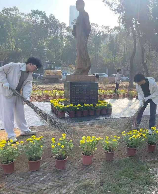 晨光中,师生们默契协作。同学们小心翼翼地擦拭雕像的每一处轮廓,细致拂去岁月积淀的尘埃;后勤老师们带领大家清扫雕像周边环境,不放过任何卫生死角。每一次拂拭,不仅清洁了校园,更是一次对校史的温情致敬。擦拭完毕,同学们依次献上鲜花,肃立鞠躬,以无声的仪式表达对学术先辈的深切缅怀与崇高敬意。
