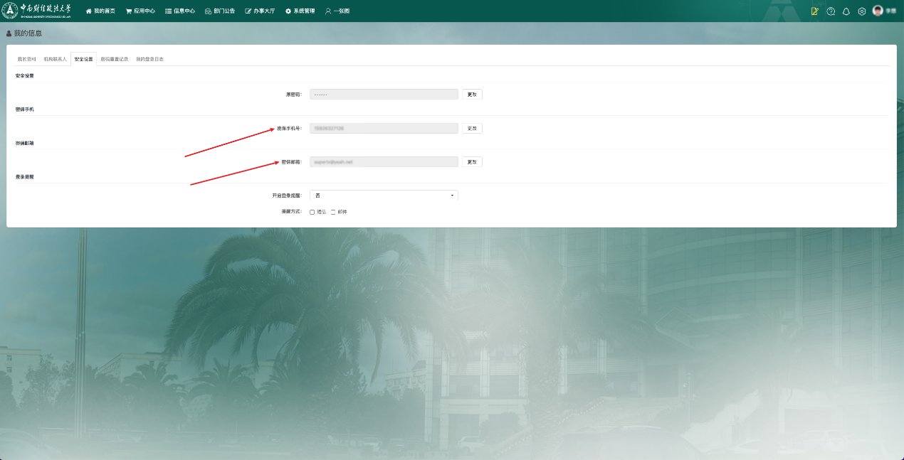 After retrieving the password, if you want to bind your mobile phone number or email address to retrieve the password, you can visit the information portal http://i.zuel.edu.cn and click My information -> Security Settings at the upper right corner of the page, as shown below: