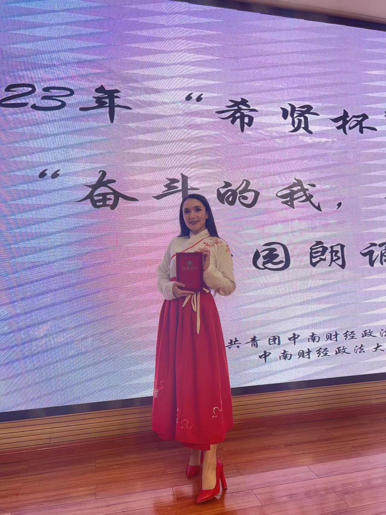 The 13th Foreign Languages Singing Final Contest was held by the Literary and Art Center of School of Foreign Languages in the Nanhu Hall of Zhongnan University of Economics and Law on the evening of May 5th, 2023. The international student from the Law School in our university, ANNABERDIYEVA AKPAMYK from Turkmenistan won the champion of this Singing Contest.