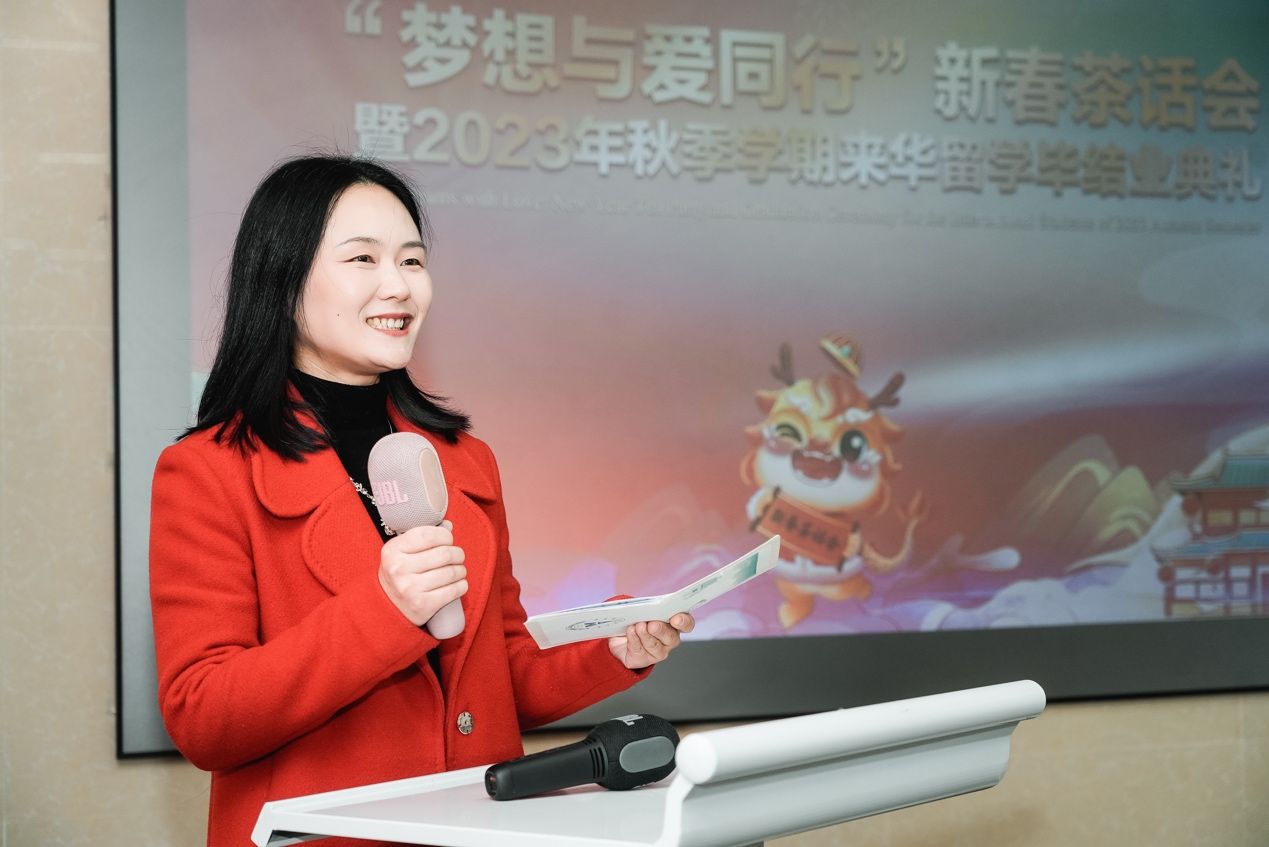 December 29th, “The Dreams with Love: New Year Tea Party and Graduation Ceremony for the International Students of 2023 Autumn Semester” was held successfully. Vice President Xu Diyu, Minister of International Exchange Office Wan Li, Vice Minister Li Yi, Dean of International Education School Zheng Ying, Vice President Qin Xiaoli, as well as more than 60 graduates and students from Russia, Kazakhstan, Laos, Egypt, Ghana and other countries attended the event. The activity was hosted by Chinese teacher Li Muzi.
