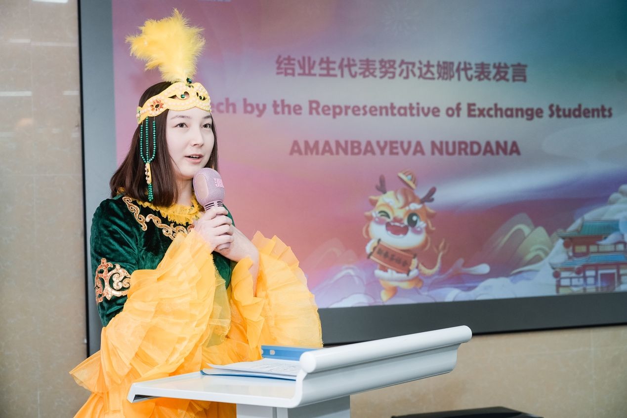Representative of Exchange Students AMANBAYEVA NURDANA was giving a speech