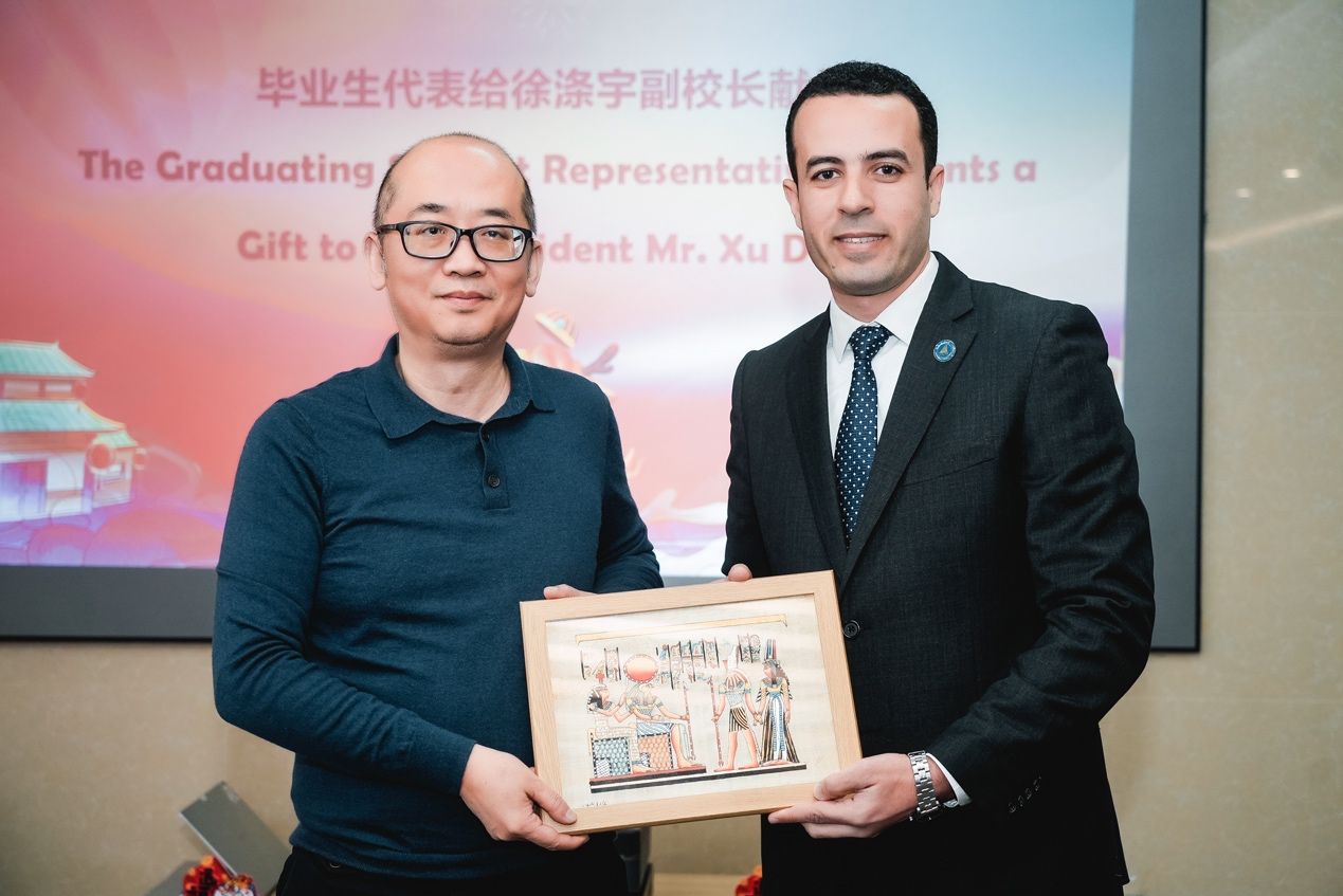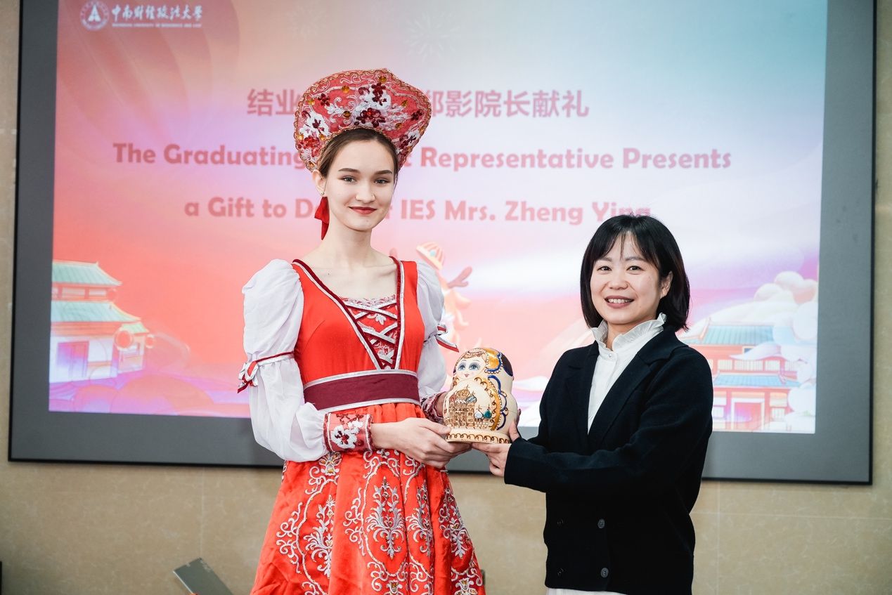 Subsequently, the school leaders present Letter of Appointment of the Alumni Liaison to representatives of graduating students, and the graduating student representative presents a gift to the Vice President Mr. Xu Diyu and Dean of IES Mrs. Zheng Ying. Blessing video was also played at the event, conveying the most sincere thanks and blessings from the students.