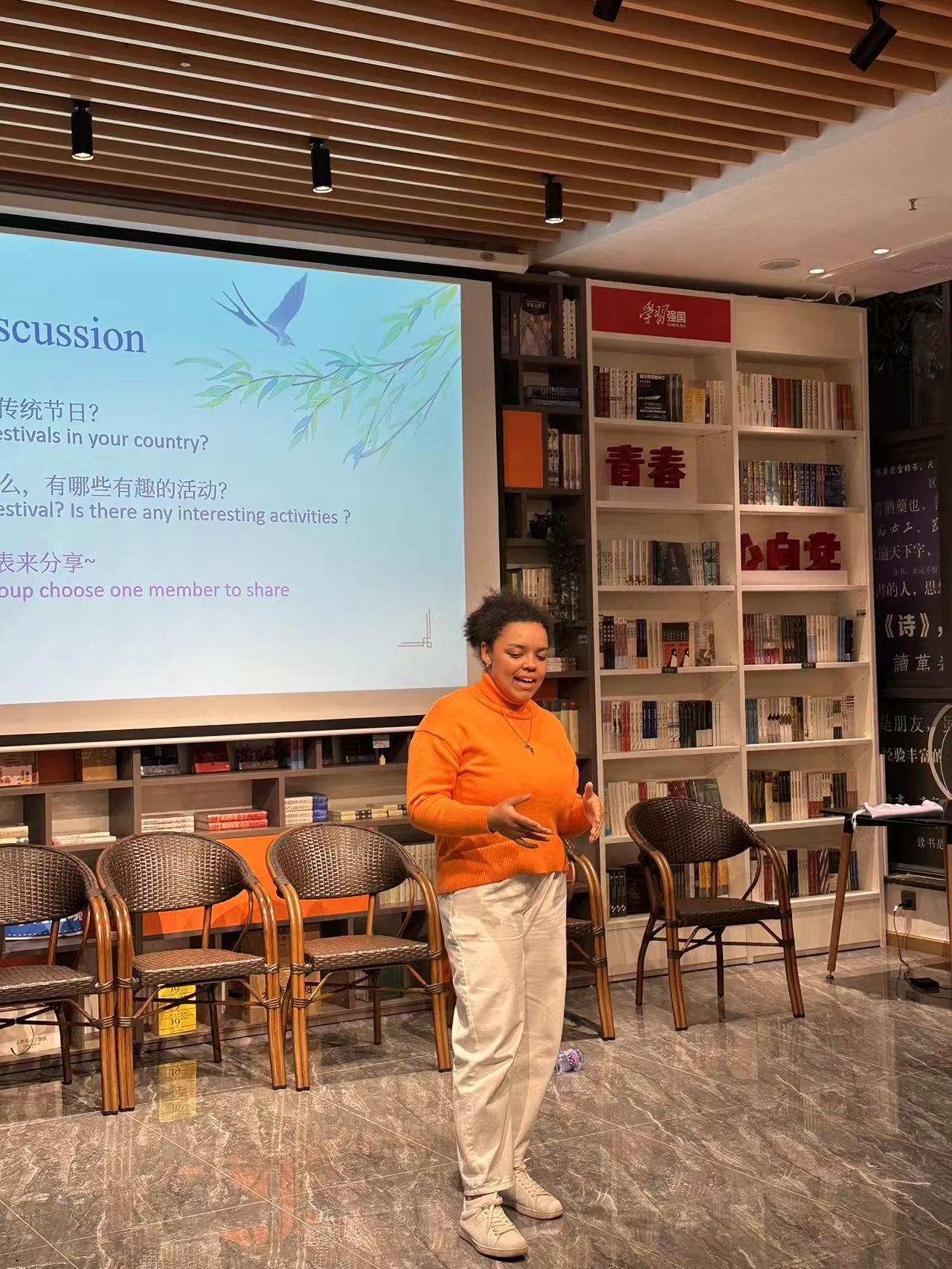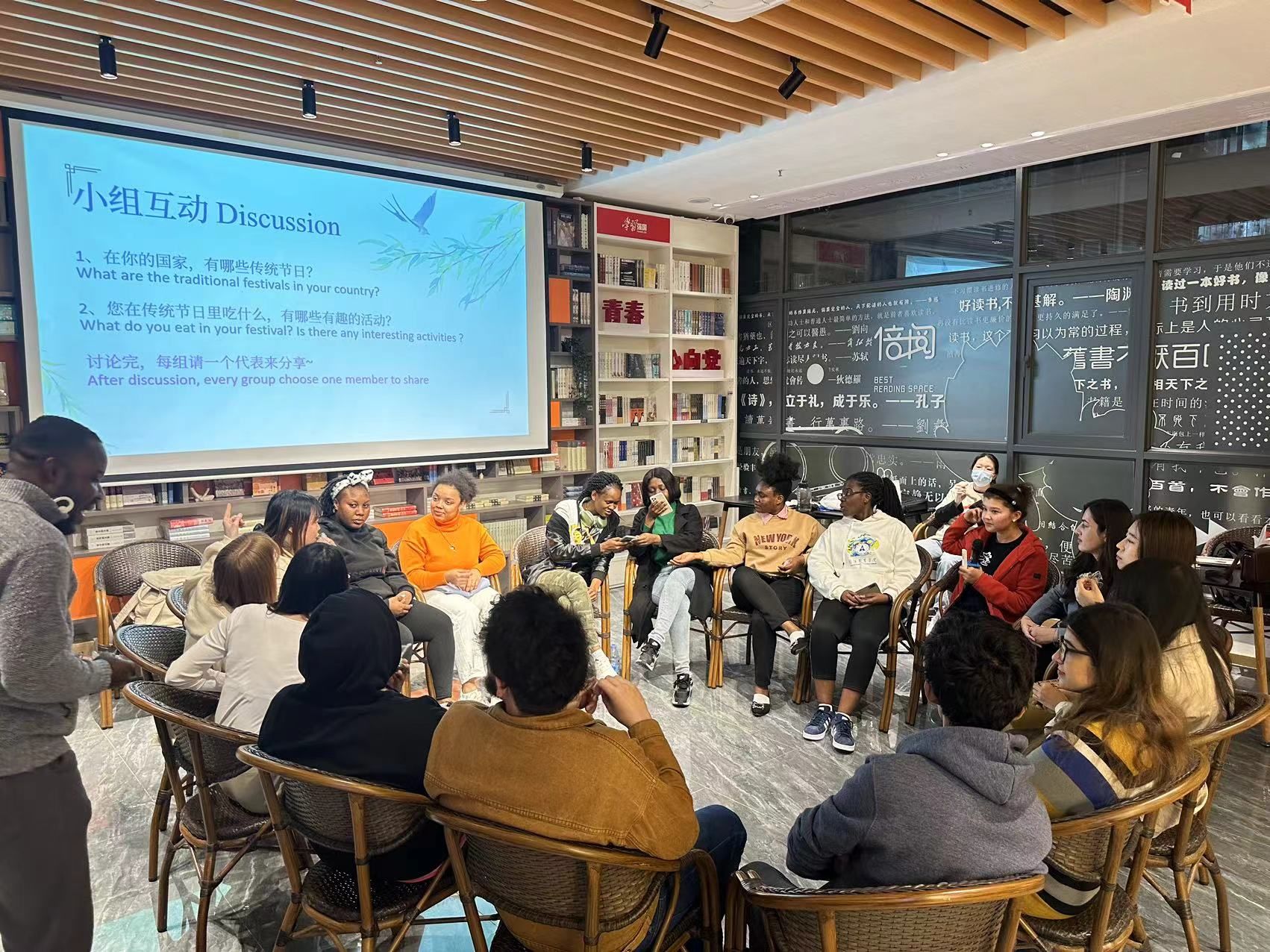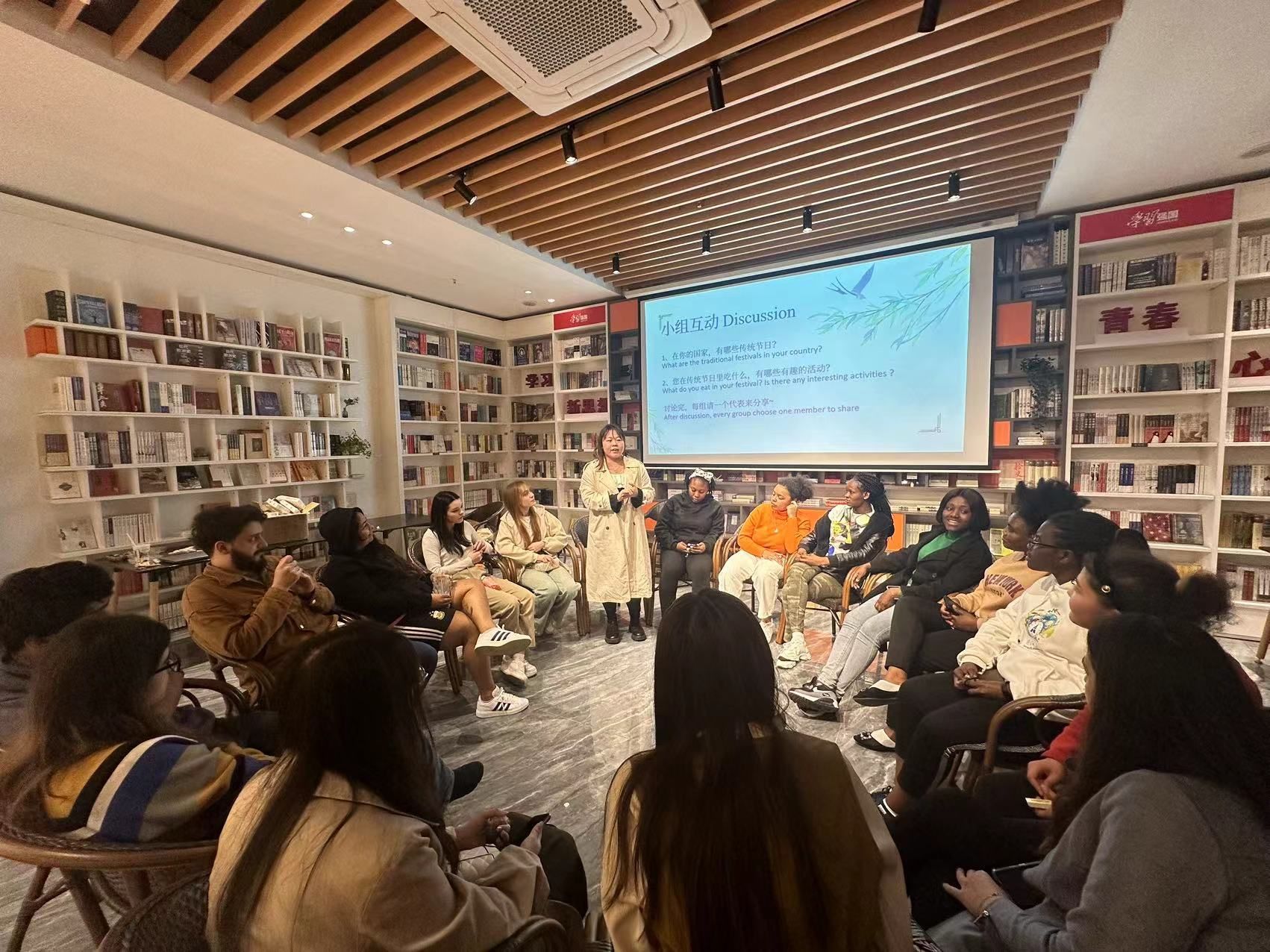 After tasting the qingtuans, Mariam divided all students into three groups to discuss with each other traditional festivals of their own country and invited a few students to share on stage.