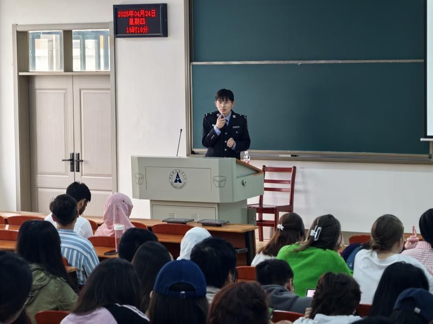 To further enhance the legal awareness and safety prevention capabilities of international students, at 16:00 on April 24th, International Education School invited police officers from the Exit-Entry Administration Bureau of the East Lake New Technology Development Zone Branch of Wuhan Public Security Bureau to visit Zhongnan University of Economics and Law and held a legal and safety education lecture with the theme of "Learn and Abide by the Law, Build a Solid Safety Defense Line" for the international students on campus.