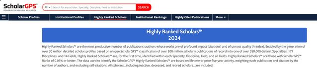 ScholarGPS aggregates information profiles of over 30 million scholars worldwide, alongside massive datasets of publications, patents, and books. Utilizing artificial intelligence, data mining, machine learning, and other data science techniques, the platform comprehensively analyzes three key metrics: research output (number of publications), influence (citation counts, excluding self-citations), and publication quality. This enables ScholarGPS to rank the excellence of more than 30 million scholars and 55,000 institutions across diverse domains, disciplines, and specialties (14 Fields, 177 Disciplines, and over 350,000 Specialties).