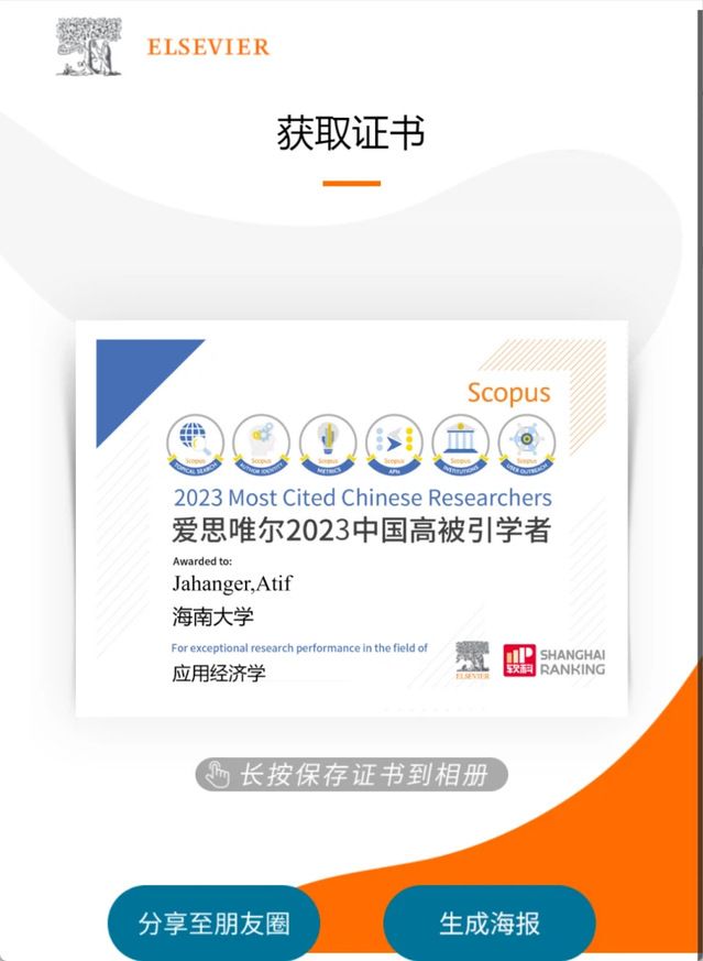 Atif Jahanger has also been consecutively recognized for the past two years on Stanford University's "World's Top 2% Scientists" list – featured on the "single-year impact" list in 2023 and the "career-long impact" list in 2024. Furthermore, he has been named to Elsevier's "Highly Cited Chinese Researchers" list in both 2023 and 2024, making him the first ZUEL international student alumnus to achieve this honor consecutively.