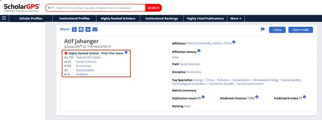 Recently, the international academic analytics platform ScholarGPS released its 2024 list of Highly Ranked Scholars™, recognizing the top 0.05% of scholars worldwide. Atif Jahanger (Pakistani), a 2021 graduate of the World Economy doctoral program at Zhongnan University of Economics and Law (ZUEL) under the supervision of Professor Yang Bo, was honored on this prestigious list. He ranks impressively within the top 0.02% across All Fields globally (Ranked 2,755th), the top 0.02% in the Social Sciences Field (Ranked 223rd), and the top 0.03% in the Economics Field (Ranked 103rd) on the "Highly Ranked Scholar - Prior Five Years" list.