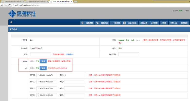 If you want to change your password, complete personal information, pay internet fee, check detailed net bill, click “self service” or visit the website http://self.znufe.edu.cn