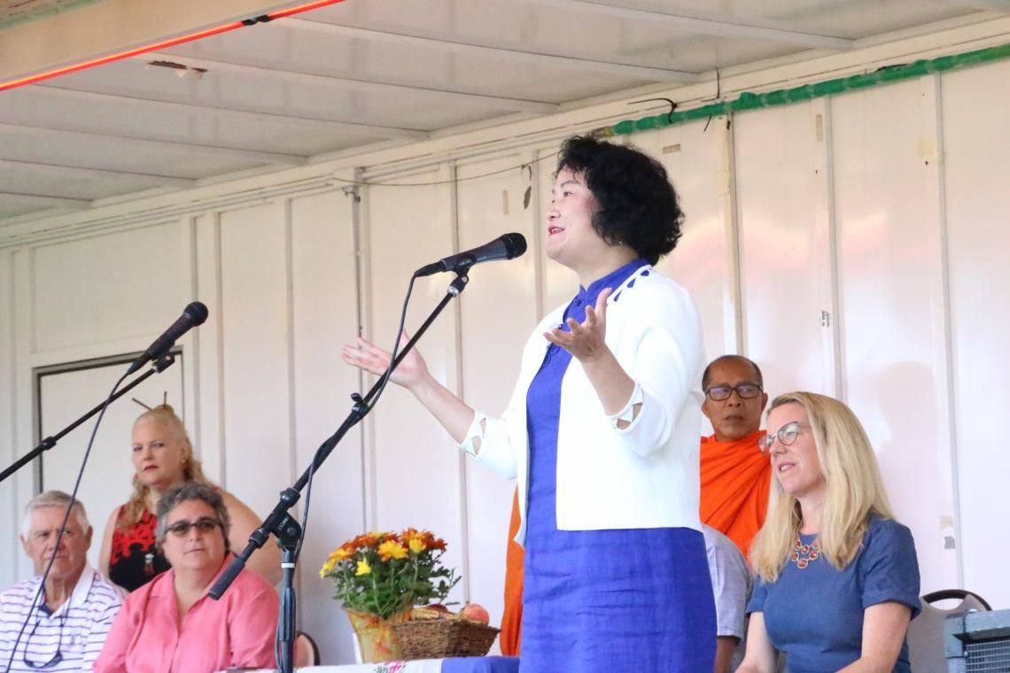 上午8点30分活动正式拉开序幕,谢群院长在开幕式上致辞。谢院长首先向本次活动的主办方以及全体工作人员致以诚挚的感谢,接着向大家简要介绍了石溪孔院建院十年的概况,以及孔院为促进中美文化交流、以及对当地文化多样性所做出的积极贡献。谢群院长表示,龙舟节在中国是一个重要的传统节日,龙舟赛这一活动不仅是力量和技巧的抗衡,更是一种团队合作精神的集中体现。她祝愿参赛队伍充分享受与队友协同作战的乐趣,并祝所有来宾度过愉快的一天。图一,谢群院长在开幕式上致辞 图二,组委会代表为龙舟节的吉祥物画龙点睛,唤醒巨龙。