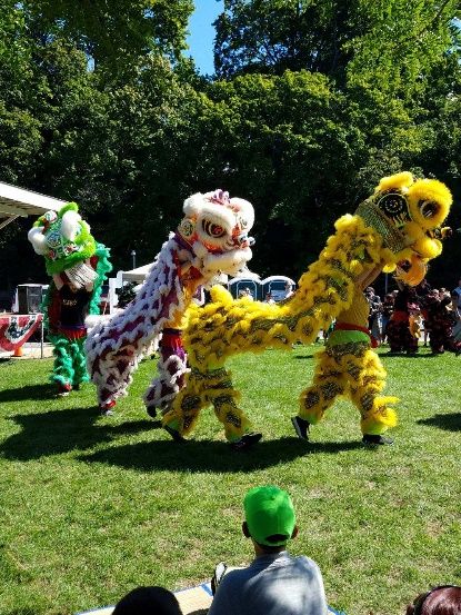 与此同时,公园的草坪上的各种展台也迎来好奇的客人和孩子。有东西方美食,有鼓励人们与大自然亲近的蛇和蜥蜴的展示,还有的中文学校耍起了空竹,吸引了众多的小朋友。