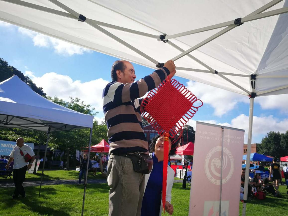活动当日,天刚蒙蒙亮,石溪孔院中方院长谢群教授就带着师生们赶到Port Jefferson港口安营扎寨。图一,把大红的中国结系上了孔院的帐篷。图二,孔院师生合影