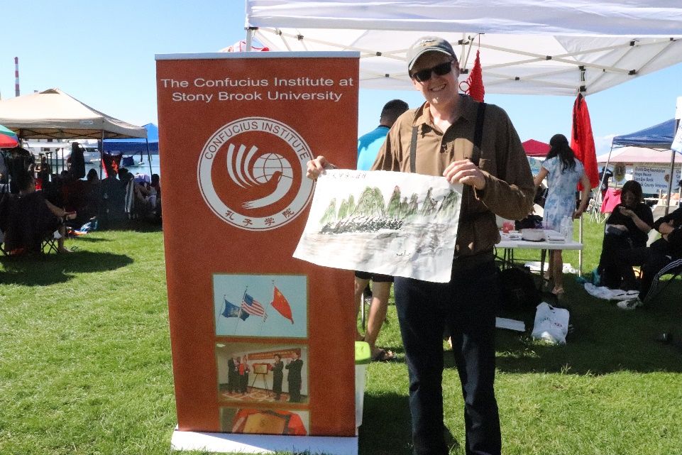 长岛华人赵天宙老师是当地著名的书画家,也是石溪大学孔子学院多年的老朋友。此次龙舟节赵老师再次应邀冒着炎炎烈日、亲临现场挥毫泼墨。