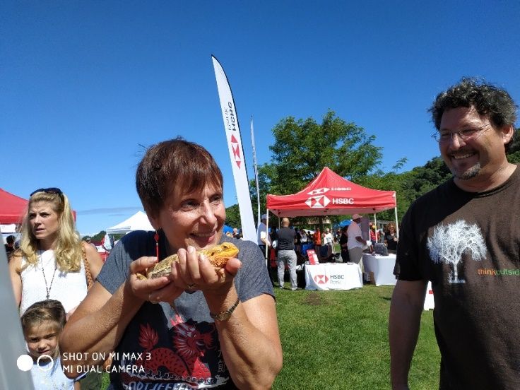 下图为龙舟节组委会负责人Barbara女士体验与蜥蜴亲密接触。