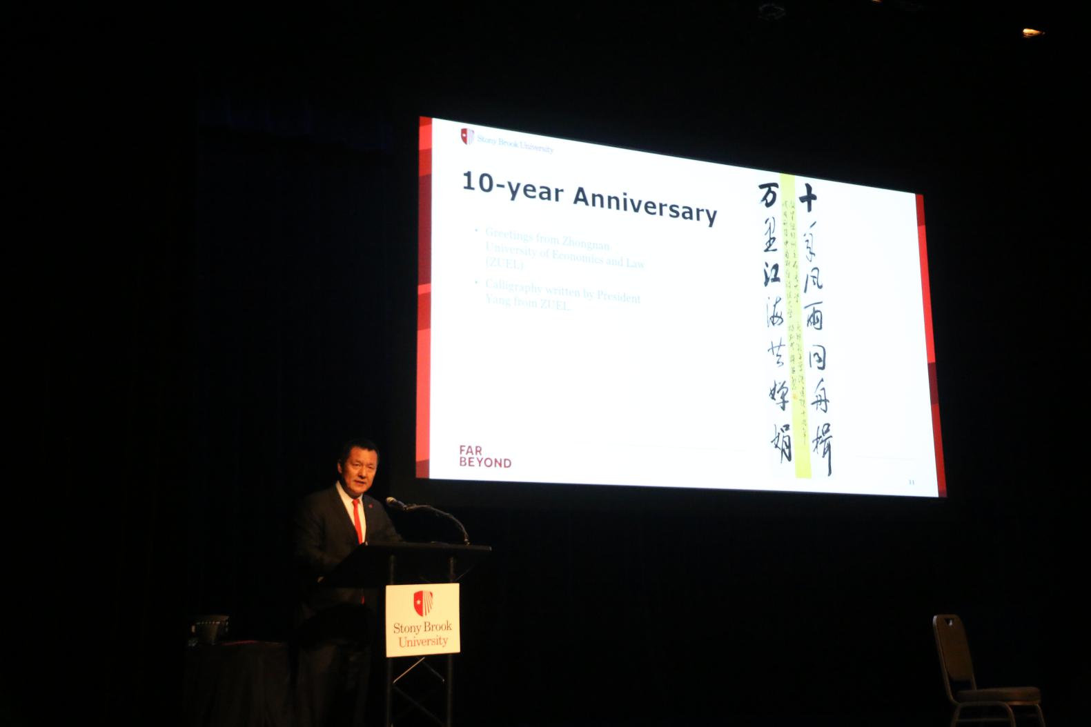 石溪大学副校长、孔子学院美方院长刘骏博士亲自主持了庆典仪式,他首先代表学校向参加本次活动的嘉宾朋友们致以热烈的欢迎。刘校长表示,此次活动意义重大,石溪大学孔子学院十年华诞,正值全球孔子学院日和中秋庆典之际,可谓三喜临门。