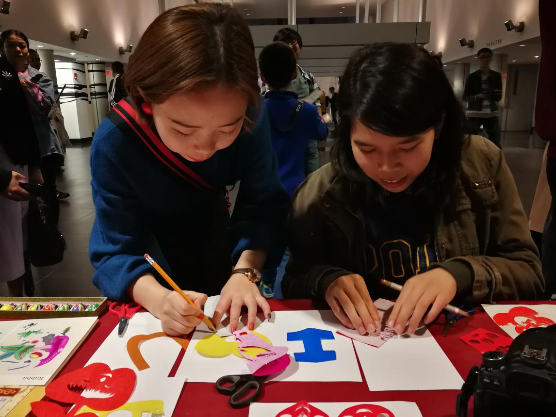 (汉语教师现场示范剪纸,引来爱好者们纷纷驻足,动手体验。)