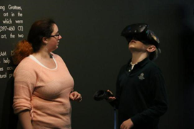 本次展览面向石溪大学全体师生及广大社区群众免费开放,通过网络预约的方式即可取得体验资格。访客们在工作人员的指导下戴上VR眼镜后,犹如置身于佛像跟前。通过控制手柄,可以近距离观看佛像和壁画,纹理细节清晰可见。在工作人员的帮助下稍稍调节手柄,就能“乘坐”虚拟电梯“升上”云端,俯瞰石窟。
