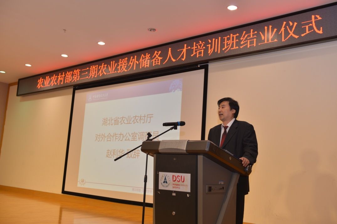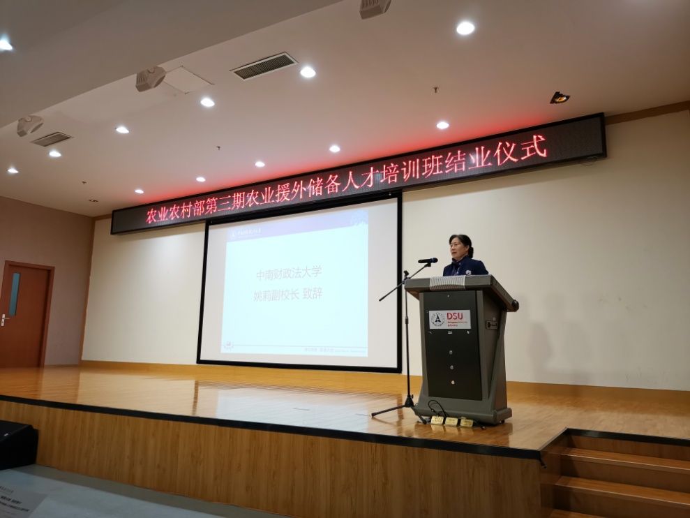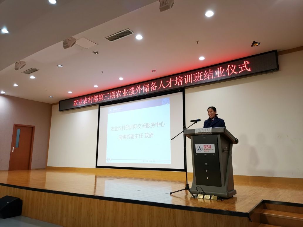 姚莉副校长代表学校向顺利完成培训任务的学员表示衷心祝贺,她指出此次培训班是作为“一带一路”倡议和“农业走出去”的重要平台,服务于中央对外政策,为援外工作的提质增效提供助力。并衷心地祝愿各位援外专家未来履职顺利,农业部援外工作不断上水平、上台阶,向世界展示我国农业大国风采。