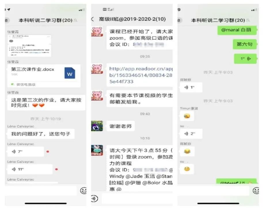 为保证汉语课线上教学的顺利进行,对外汉语教研室王耿、牛长伟等13名汉语教师(含外聘)分别测试了腾讯课堂、微信会议、ZOOM会议、雨课堂、中文路等多个在线教学平台,并提前组织学生测试平台效果,最终决定根据各班学生情况灵活使用多种平台。同时与研究生院及学校直播保障团队保持沟通,及时反馈教学情况及效果。