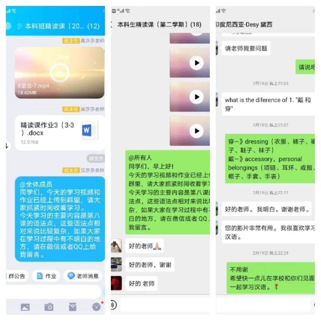 本科班课程《汉语精读(二)》有留学生17名,目前分布于9个国家,线上开课面临着部分国家网络不畅、时差过大以及授课平台不通用等问题,吴莎莎老师采用QQ群授课和微信群授课相结合的方式,将事前录制好的教学视频和教学资料发送到两个群里供学生自主学习,并进行在线教学答疑。每周布置的作业也会在当周批改后通过微信发送给每个学生,及时给予学生反馈。