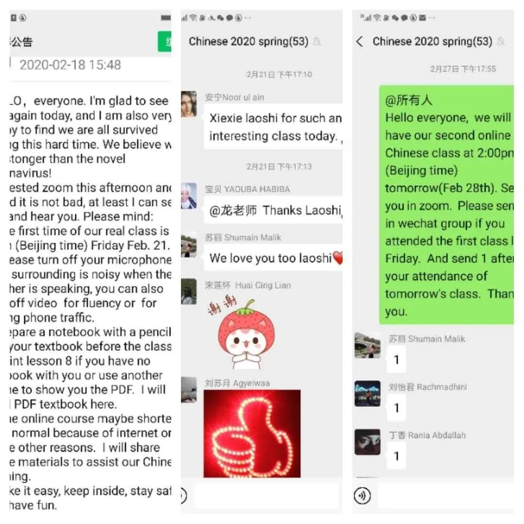 在“停课不停学”的精神指引下,国际教育学院师生的教学和学习热情高涨,汉语教研室与留学生共同努力,解决了网络、时差、授课平台等诸多问题。