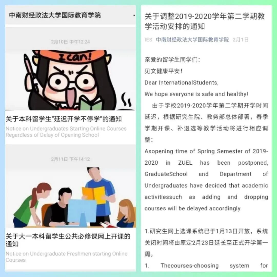 (通讯员:雷兰)为贯彻落实教育部、省教育厅和学校疫情防控指挥部关于做好防疫期间高校教育教学工作的要求,国际教育学院高度重视,精心谋划,迅速成立线上教学工作领导小组,制定《国际教育学院汉语教学预案》,统筹推进留学生汉语课线上教学工作。学院先后双语发布了《关于调整2019-2020学年第二学期教学活动安排的通知》、《关于本科留学生“延迟开学不停学”的通知》、《关于本科留学生公共必修课网上开课的通知》、《答疑Q&A—关于网上开课及其他培养问题》等通知,全力保障留学生“停课不停学”,并努力确保教学质量。截至本周,国际教育学院线上汉语课程实现了全面开课。