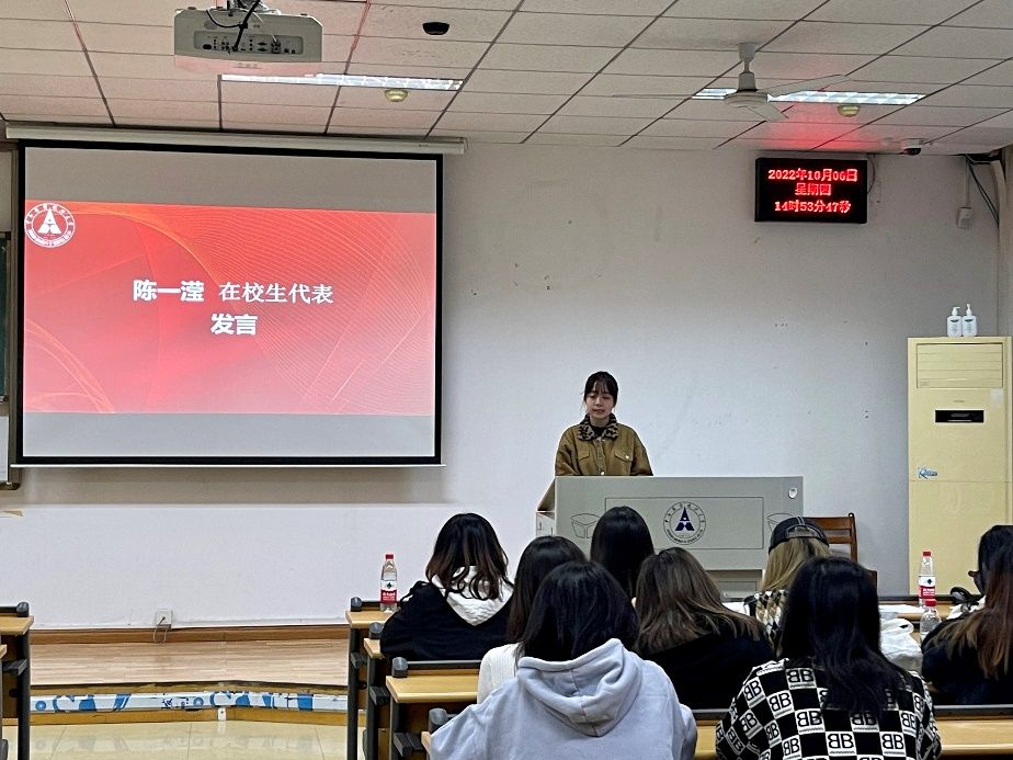 接着,陈一滢作为在校生代表发言。她鼓励同学们在学有余力的同时参加丰富多彩的校园活动,多方面锻炼自己,把握机遇,与国家发展共同前进。