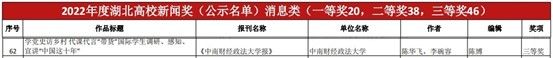 近日,2022年度湖北省高校新闻奖评选结果揭晓,我院新闻作品《学党史访乡村 代课代言“带货”,国际学生调研、感知、宣讲“中国这十年”》(作者:陈华飞、李碗容,编辑:陈博)荣获消息类三等奖。这是我院首次获得湖北高校新闻奖。