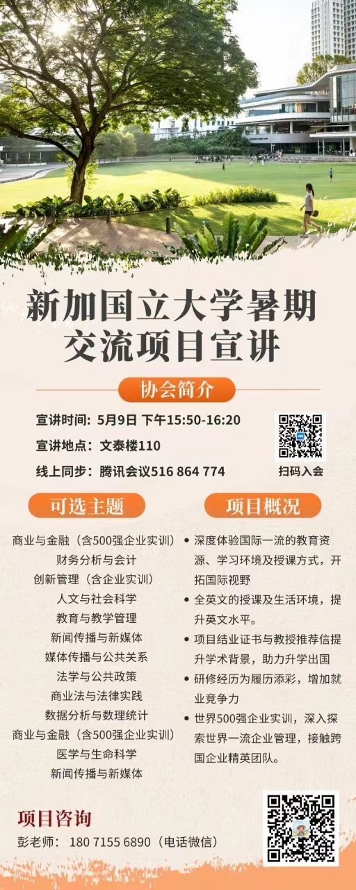 根据两校合作协议,为拓宽学生国际化视野,加快培养具有全球视野的高层次人才,项目组织方将面向我校学生开展暑期新加坡国立大学暑期交流项目宣讲,具体信息如下:
