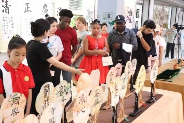 文化交流环节结束后,国际学生们又参观了大花岭小学的特色展区。他们仔细欣赏了景泰蓝掐丝珐琅作品、师生书法、绘画和手工等作品,对中国传统文化的博大精深表示由衷的赞叹。
