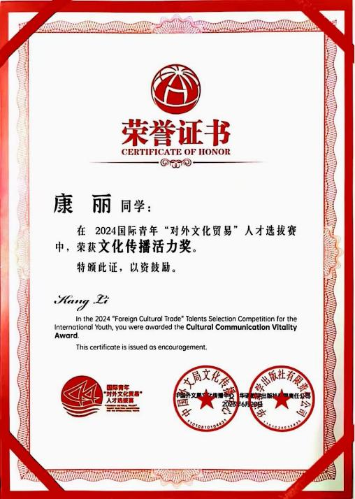 (通讯员朱雅婕)5月28日,由中国外文局文化传播中心和华语教学出版社联合主办的2024国际青年“对外文化贸易”人才选拔赛颁奖典礼暨归国创业培训启动仪式在北京举行。来自土库曼斯坦的本科生国际学生Annaberdiyeva Akpamyk(康丽)提交的参赛作品《我在中国学生时代最美好的时光》荣获“文化传播活力奖”,我校连续两年获评“优秀院校组织奖”。典礼现场,康丽作为“留学中国云合唱团”成员表演合唱节目《梦想之路》。