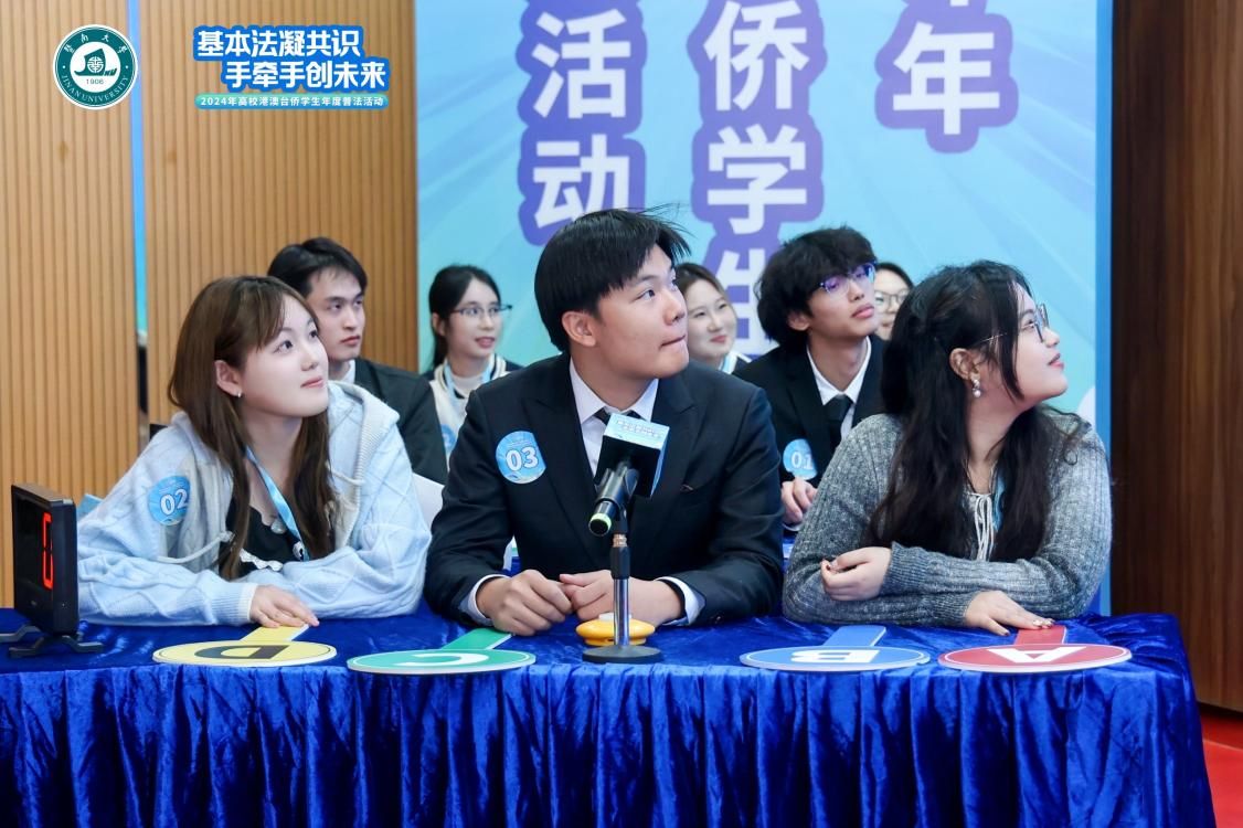 据悉,“2024年高校港澳台侨学生年度普法活动”由教育部港澳台办公室、中央人民政府驻香港特别行政区联络办公室广东联络部及中央人民政府驻澳门特别行政区联络办公室广东联络部指导,广东省教育厅、中共广东省委港澳工作办公室支持,广东省高等教育学会港澳台侨学生管理研究分会主办,内地与港澳法学教育联盟粤港澳大湾区法学教育与人才培养联盟协办,暨南大学承办。2024年高校港澳台侨学生年度普法活动于11月下旬正式开启,问答题目围绕《中华人民共和国宪法》《香港基本法》《澳门基本法》《香港国安法》《澳门国安法》以及香港澳门的人文地理历史风情展开,专业性与趣味性的融合。活动得到全国近46所高校的踊跃参与,参与人数超5000人次。经过激烈的线上知识问答比拼,共有11所高校代表队伍脱颖而出,顺利晋级基本法“校园行”线下知识问答比拼。