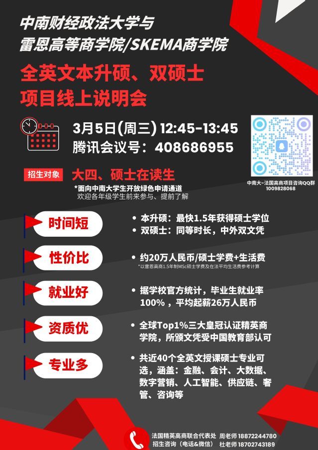 2025.09——2026.05 法国高商硕士课程、中南大研二在册