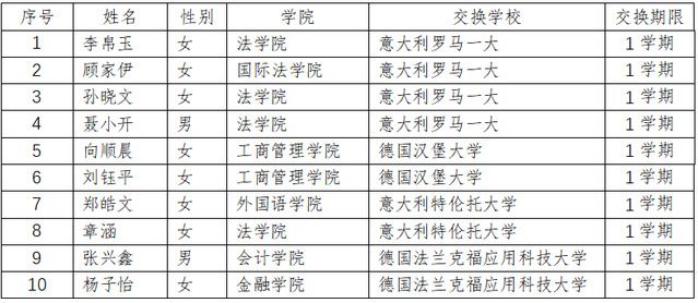 经专业学院推荐、国际教育学院组织评审,学校同意推荐以下10名同学参加2026年春季学期交换生项目,现予以公示。