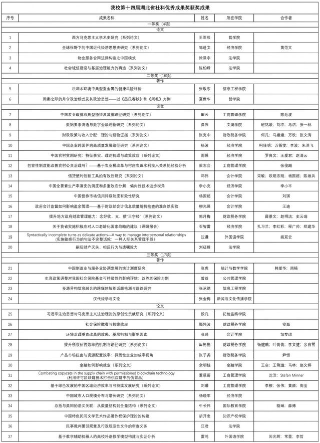 湖北省社会科学优秀成果奖由湖北省人民政府设立,每两年评审一次,是全省社会科学领域最高级别的奖项。此次评选对全省哲学社会科学界2021年至2022年期间公开发表的成果进行评选,共评出优秀成果395项,其中一等奖67项,二等奖157项,三等奖171项。