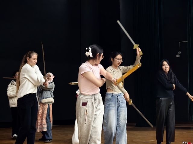 核心体验环节中,留学生们全方位感受京剧艺术的多元魅力。在知识讲解与脸谱绘制环节,京剧团传承人用通俗语言解读京剧四大行当区分、脸谱色彩象征意义等核心内容,展示了马鞭、长枪等代表性道具及褶子、帔等戏服,现场演示虚拟动作技巧。留学生们手持空白脸谱模板,在颜料与画笔的映衬下,发挥创意绘制专属脸谱,将文化理解融入艺术创作。随后的互动实践课上,传承人因材施教,京剧团成员起解经典选段的基础唱腔与旦角碎步、生角亮相等身段动作,brige + 来华留学志愿服务队成员全程协助纠正发音与姿势,让留学生在亲身实践中体会京剧唱、念、做的艺术精髓。经典剧目展演环节,百花赠剑红娘折子戏片段精彩上演,演员们精湛的唱念做打与鲜明的角色形象,让留学生直观感受京剧的综合艺术魅力与背后的文化价值观。