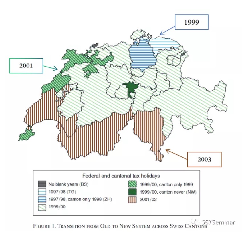 税制改革的时序性:1990年9月瑞士联邦出台相关法案:各州须在2001年前后税制改革,随之各州实施公投选择改革时间。具体而言,有两个州选择在1999年改革,三个州选择在2003年改革,其余绝大多数州选择在2001年改革。分别对应于图中的蓝色、绿色和棕色,其中颜色较深的部分代表该州地方税免税期仅有一年。