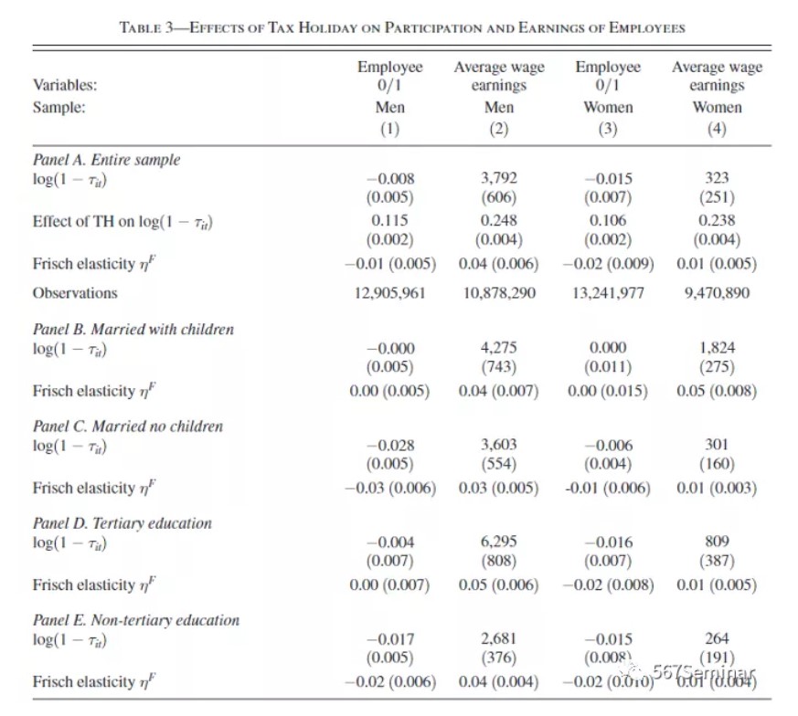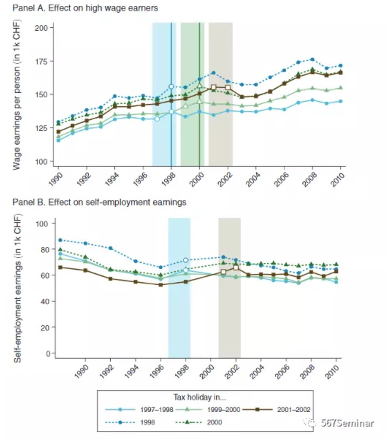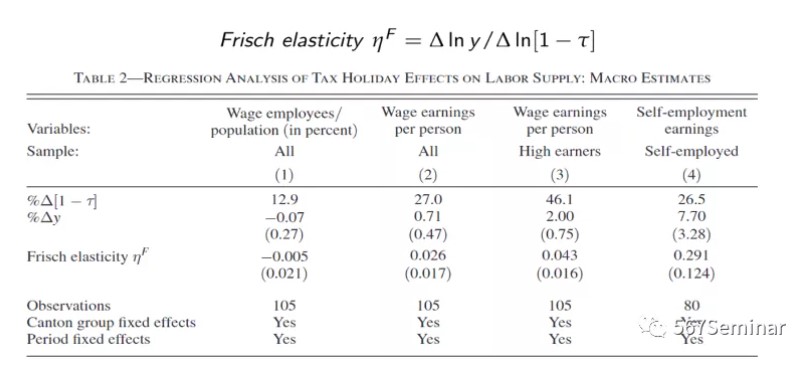 本文以一至两年的免税期改革为背景,通过瑞士社保数据(SSER)与人口普查数据(Census)相匹配研究免税期各州边际(平均)税率变化情况。结果发现,免税期使得税后净收益率(the net of tax rate,定义为-1 -边际税率-)增加了25-30%,即边际税率出现了一个明显的下降。在此基础上,一方面,从宏观州整体角度采用DID识别各州免税期就业率和收入的变动。另一方面,从个体微观层面采用事件研究法和IV相结合的方式再次验证免税期对劳动供给的影响,并精确地估算出相应的弗里希弹性,其范围在0到0.29之间。