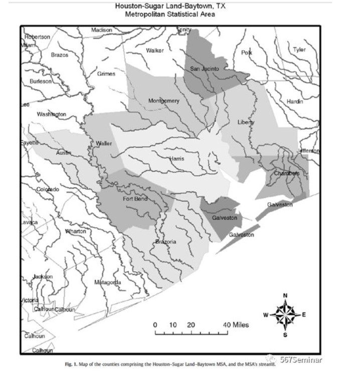 为解决以上问题,本文使用美国环境研究所2008年的地理信息系统(GIS)数据,将都会区内小溪的总长度(不包括人工河流)作为辖区间竞争程度的工具变量进行2SLS估计。图1展示了小溪如何对波士顿内的辖区进行划分。