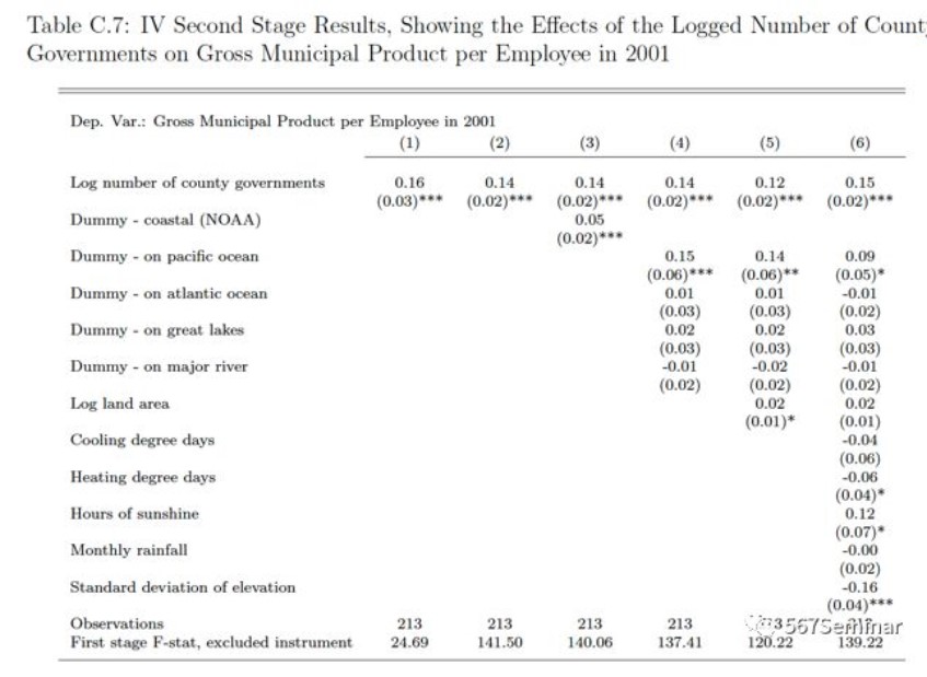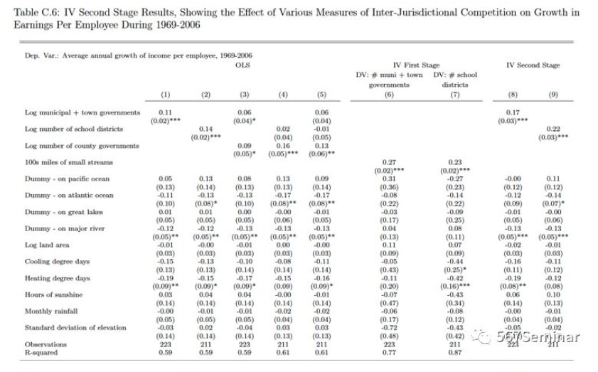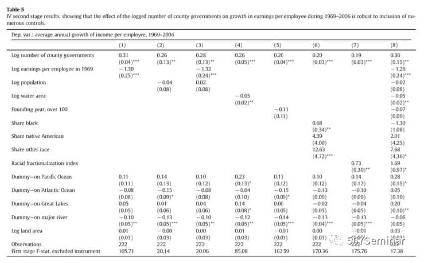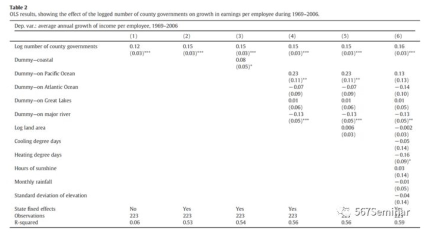 被解释变量为1969-2006年的雇员收入的年平均增长率,核心解释变量为都会区内县政府的数量。作者认为在识别中可能会有以下内生性问题:(1)一方面,有种族冲突或政治冲突的区域可能会自发的形成不同的辖区,使得辖区的形成非随机。另一方面,这种局势也对当地的收入和经济增长产生负面的影响;(2)在气候恶劣和地形崎岖的地方很难进行迁移,从而不利于居民收入增加和经济增长;(3)都会区成立的时间越早,管辖权可能会越大;(4)成立时间早的都会区可能有更多的夕阳产业,这也会阻碍当地的发展。