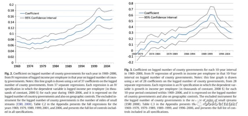 本文将分权定义为辖区间竞争的程度,并使用都会区(MSA)内县政府的数量作为辖区间竞争程度的度量指标,分析其对经济增长的影响。OLS估计表明,当地县政府数量的增加对1969-2006年雇员收入的年平均增长率有显著为正的影响,在控制了人口、种族结构和建县时间等一系列变量后结果依然显著。进一步,为克服内生性问题,作者使用都会区内小溪的总长度作为都会区内县政府数量的工具变量进行2SLS估计,其结果与OLS估计保持一致且影响程度更高。