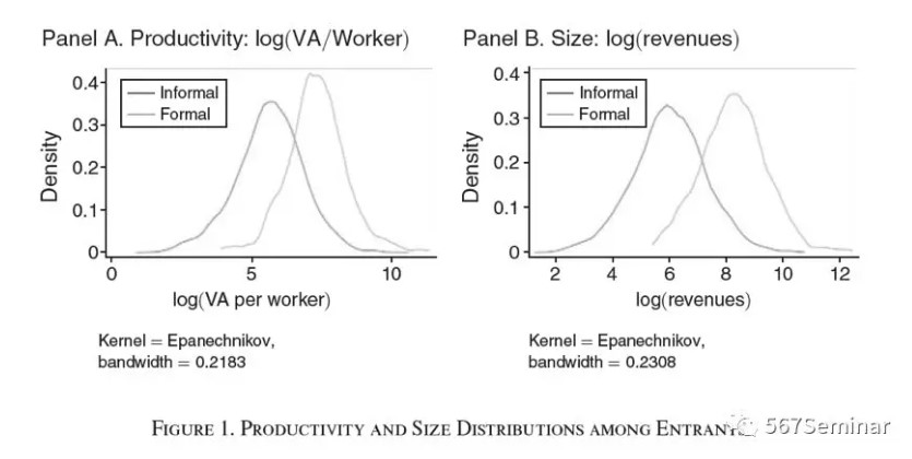 本文认为进行非正规性研究时需要先明确两个非常重要的定义:一是非正式企业,二是非正式员工。非正式企业指的是没有在税务机关注册的企业,意味着这些企业没有纳税识别号,而非正式员工指的是没有签订正式劳动合同的员工。在进行理论模型构建之前,作者利用了ECINF、RAIS、PNAD三个数据库提供有关巴西非正规性的一些事实证据。首先,作者从不同部门的样本中挑选出进入时间小于1年的企业,将它们的生产率变量作为企业进入不同部门的决策代理变量,从图1我们可以发现企业做出进入正式部门或非正式部门的决策是由它们进入之前的生产率所决定的,而且正式企业和非正式企业两者的生产率和规模分布存在重合区域,表明两者不仅存在于同一个行业,而且具有相同的生产率。