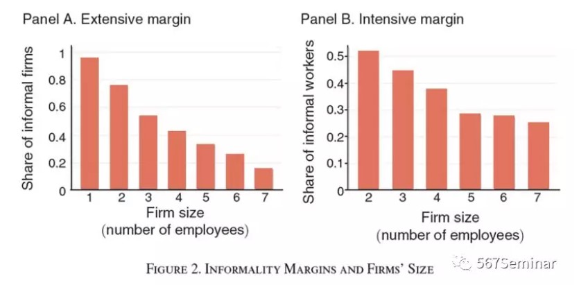 已有的不同研究都通过实证数据检验了非正规性的扩展边际,而分析非正规性的集约边际的研究则非常少。非正规性的扩展边际(extensive margin)指的是企业是否进行注册并支付注册费用进入到正式部门,可以用一定规模下非正式企业占比来表示。集约边际(intensive margin)则强调企业是否雇佣非正式员工,即本文提出的劳动力非正规性概念,指的是一定规模水平的所有企业中非正式工人占比。如图2所示,扩展边际和集约边际都会随着企业规模的增加而降低。本文利用ECINF(PME)数据库进行分析发现,正式企业中雇佣非正式员工的比例高达40%(52%),表明劳动力的非正规性在现实世界里是一个更值得关注的话题。