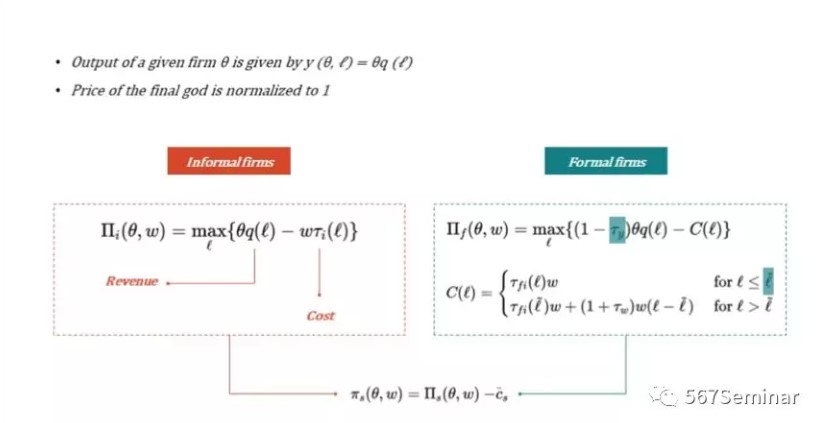 根据前面分析得到的一些事实,作者对Melitz(2003)提出的模型进行完善,构建了一个能够同时研究企业的扩展边际反应和集约边际的均衡模型。该模型要求满足以下几个假定:(1)企业之间的差异由生产率𝜃所决定的;(2)企业生产的商品是同质的,劳动力是唯一的投入要素;(3)劳动力市场和产品市场是完全竞争市场,非正式企业和正式企业面临的产品价格是一样的,假定为1。作者首先分析了劳动力是同质的简单情形,然后再进一步考虑劳动力异质性(高、低技能)的情况。基于上述假定,作者得到了不同类型企业的利润最大化函数,如下所示,其中代表正式企业雇佣非正式工人的临界值。𝜏i(l)、𝜏fi(l)分别代表非正式企业和正式企业雇佣非正式工人的成本,𝜏y代表企业所得税,Cs代表固定成本,角标s = f、i,代表正式和非正式部门。企业在未进入某个部门时只能根据观测到的生产率参数预期进入之后的企业价值,𝜃表示企业进入某个部门之后的实际生产率,其中v~G,𝜃~F(𝜽|v)。