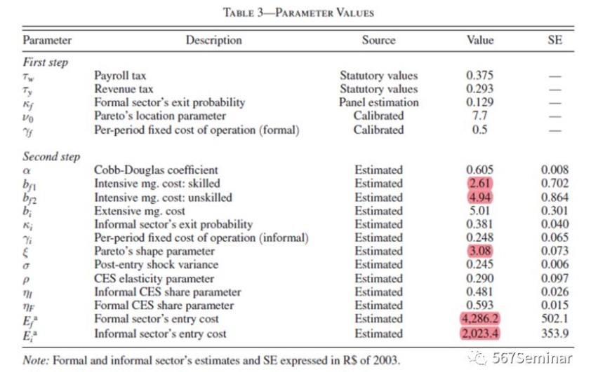 对模型参数化之后,作者将需要估计的参数分为两大类:一类是可以直接得到或估计出来的参数,一类是需要采用SMD(Simulated Minimum Distance)方法估计得到的。参数的含义、估计方法、估计系数结果如表3所示,其中正式部门的进入成本(Efa)为非正式部门进入成本(Eia)的两倍,符合之前的预期假定。文中一系列检验表明估计模型具有很好的拟合性。