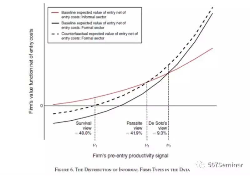 估计模型并不是研究的最终目的,而是为了进一步分析经济学问题。已有的研究关于企业为什么留在非正式部门的观点可以总结为三种:(1)-Survival-观点。企业的生产率过低以至于无法在正式部门当中持续经营。(2)-Parasite-观点。企业虽然可以在正式部门当中生存,但是在非正式部门生产可以获得更多的利润,因此它会选择留在非正式部门。(3)-De Soto’s-观点。过高的进入成本是一部分企业进入正式部门的主要障碍,一旦障碍消除,企业将会进入正式部门。作者利用估计的模型对这三种类型的企业数量情况进行分析,结果如图6所示,三种类型的企业占比分别为48.8%、41.9%、9.3%。