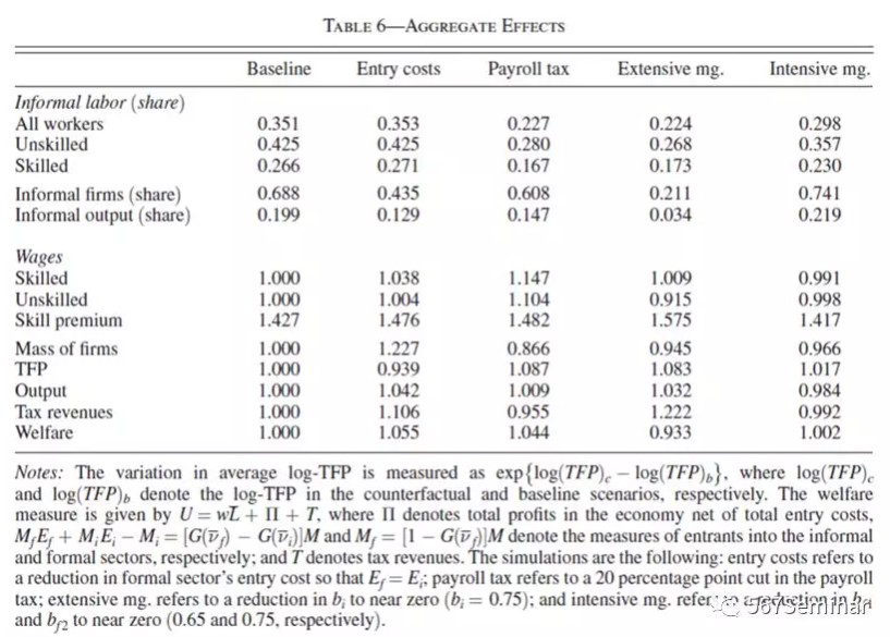 除此之外,作者还利用估计模型进行了一系列正规性政策的反事实分析,分别考虑了降低正式部门的进入成本、降低工资税以及加强对企业非正规性、劳动力非正规性的监管对企业层面和社会总体的影响,结果如表6所示。总的来说,加强对非正式企业的监管能够有效降低非正规性水平,但是会降低整体的社会福利水平。与此相反,降低正式部门的进入成本虽然在降低非正规性水平不像加强征管那么有效,但是该政策会增加社会的总福利,导致GDP和工资总额的增加。