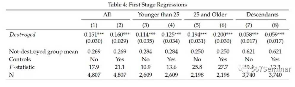为准确估计韦斯特曼群岛人口搬迁的长期因果效应,缓解人口搬迁的选择性偏误问题(如低技能劳动力工作的不确定性),本文利用了火山爆发对房屋毁损的随机性,使用工具变量的方法进行估计。具体而言,工具变量的一阶段回归设定如下: