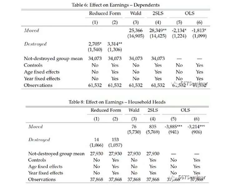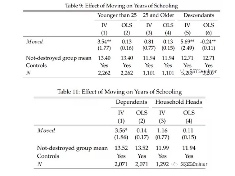 研究发现,房屋被毁而被迫搬迁的群体在未来反而获得了更高的收入和教育回报。具体而言,搬迁使得个人年收入增加约27,000美元,即使从长期来看,收入回报也一直存在。然而,收入回报的分配在家庭内部是不均的,只有子女(第二代)享受了搬迁的收益而父母(第一代)则承担了成本。对于年轻人而言,个人受教育的年限也在搬迁之后延长了约3.5年左右,与收入回报类似,教育回报也体现在了后代的身上。