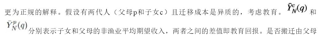 做出决定,考虑到房屋毁损后的搬迁成本m’高于正常的搬迁成本m,两类情况下的均衡点分别为q*’和q*。q*以上的工人无论房屋是否毁损均选择搬离从事非渔业,q*’以下的工人无论房屋是否毁损均选择留在原居住地,两者之间的工人即被迫搬迁的群体。所有选择的结果均是从事具有比较优势的行业。关于模型更详细的设定参考原文第6节。